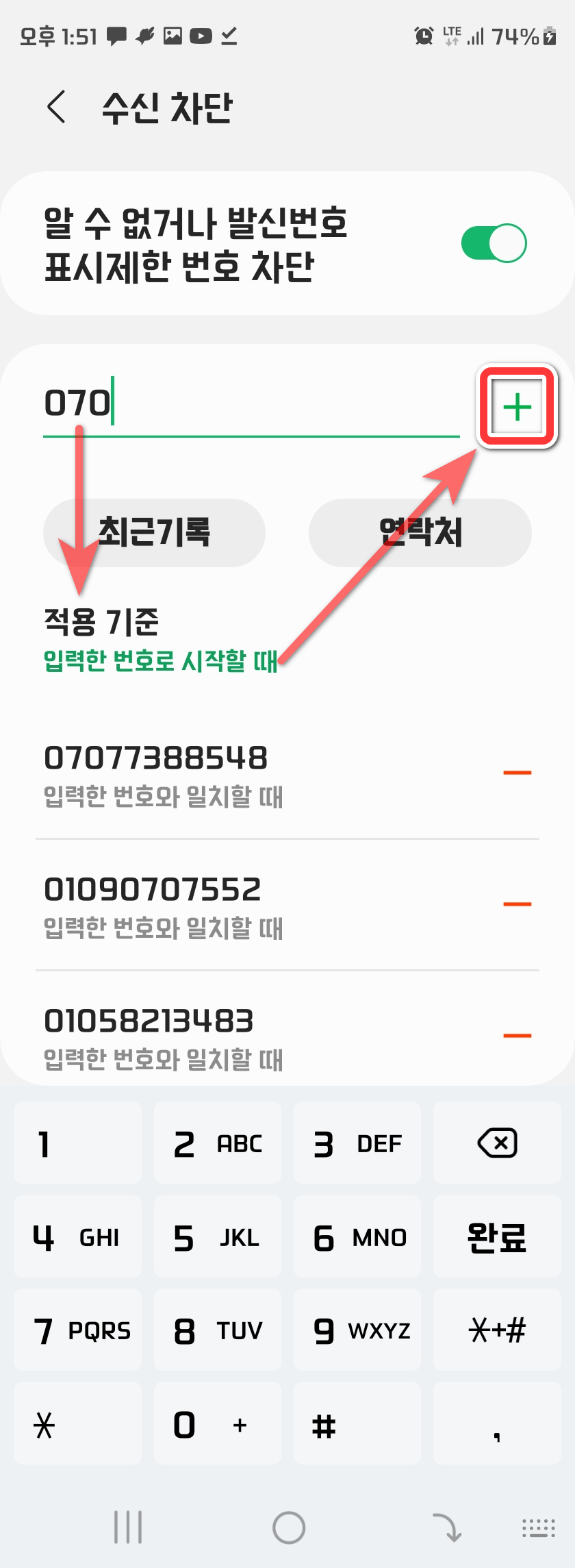 여기서 070을 비롯하여 080 이나 1800 따위 평소에 자주 오는 반복성 짙은 스팸 번호 앞자리를 넣어도 됩니다. 받고 싶지 않았던 번호들 앞자리를 모두 등록하세요. 한번에 다 되는 것이 아닙니다.
