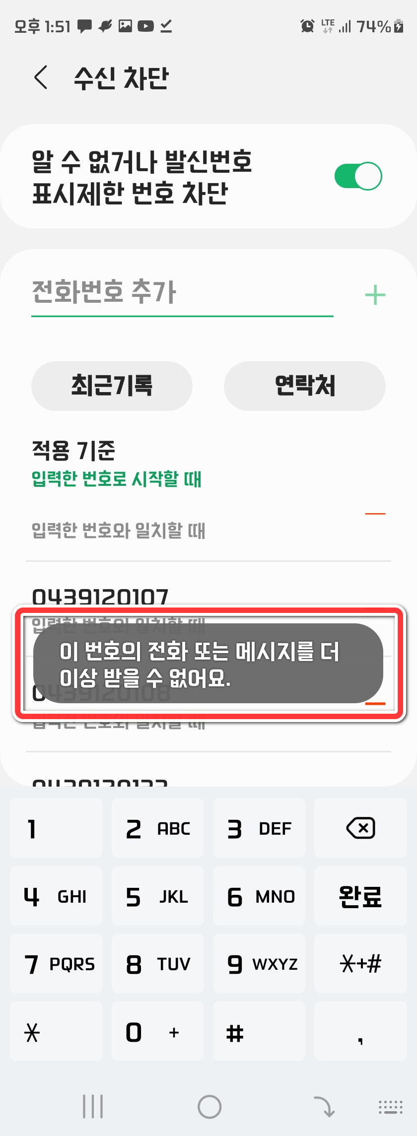 위 과정을 거치면 등록된 번호로 시작하는 전화나 문자는 수신되지 않습니다.