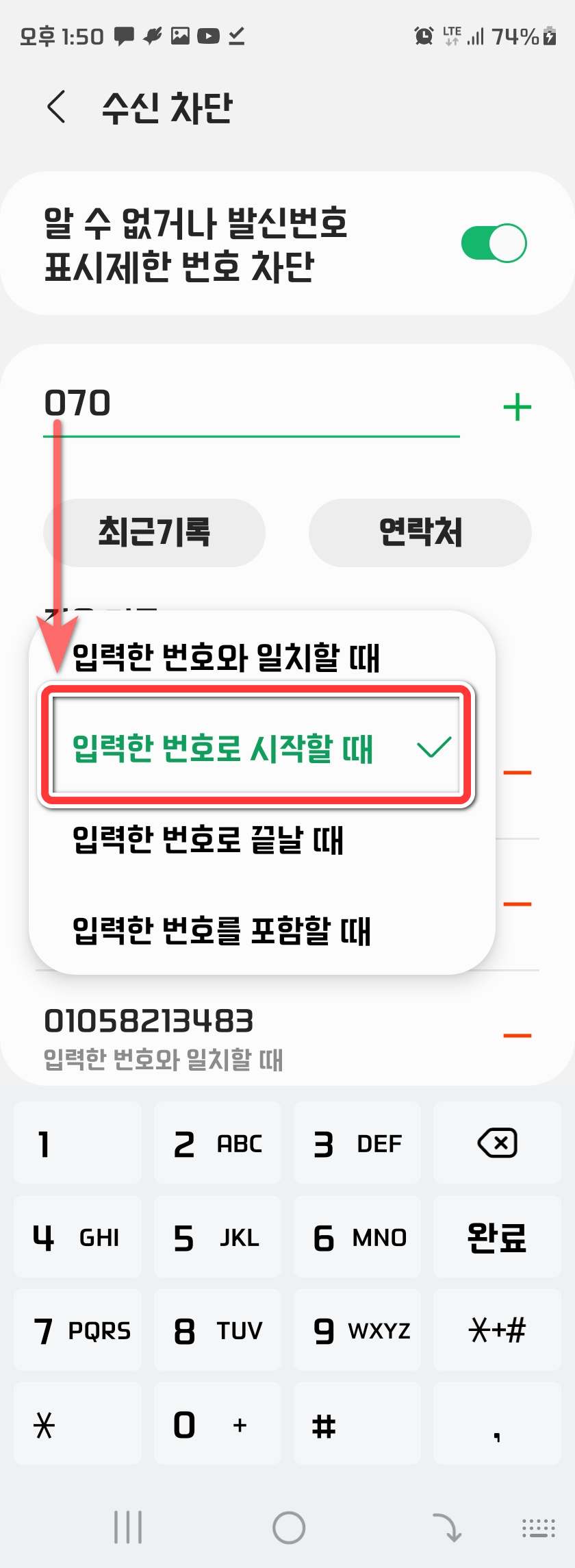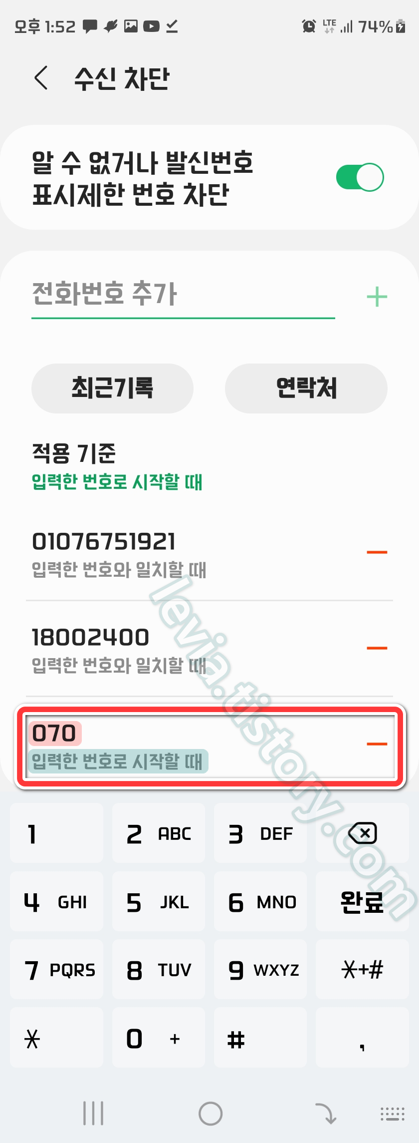 070번호 위치를 살펴보면 마지막 그림과 같이 등록된 걸 확인하실 수 있고, 앞으로는 [070] 및 직접 입력한 번호로 시작할 때 이 번호의 전화 또는 메시지를 더 이상 받지 않게 됩니다.